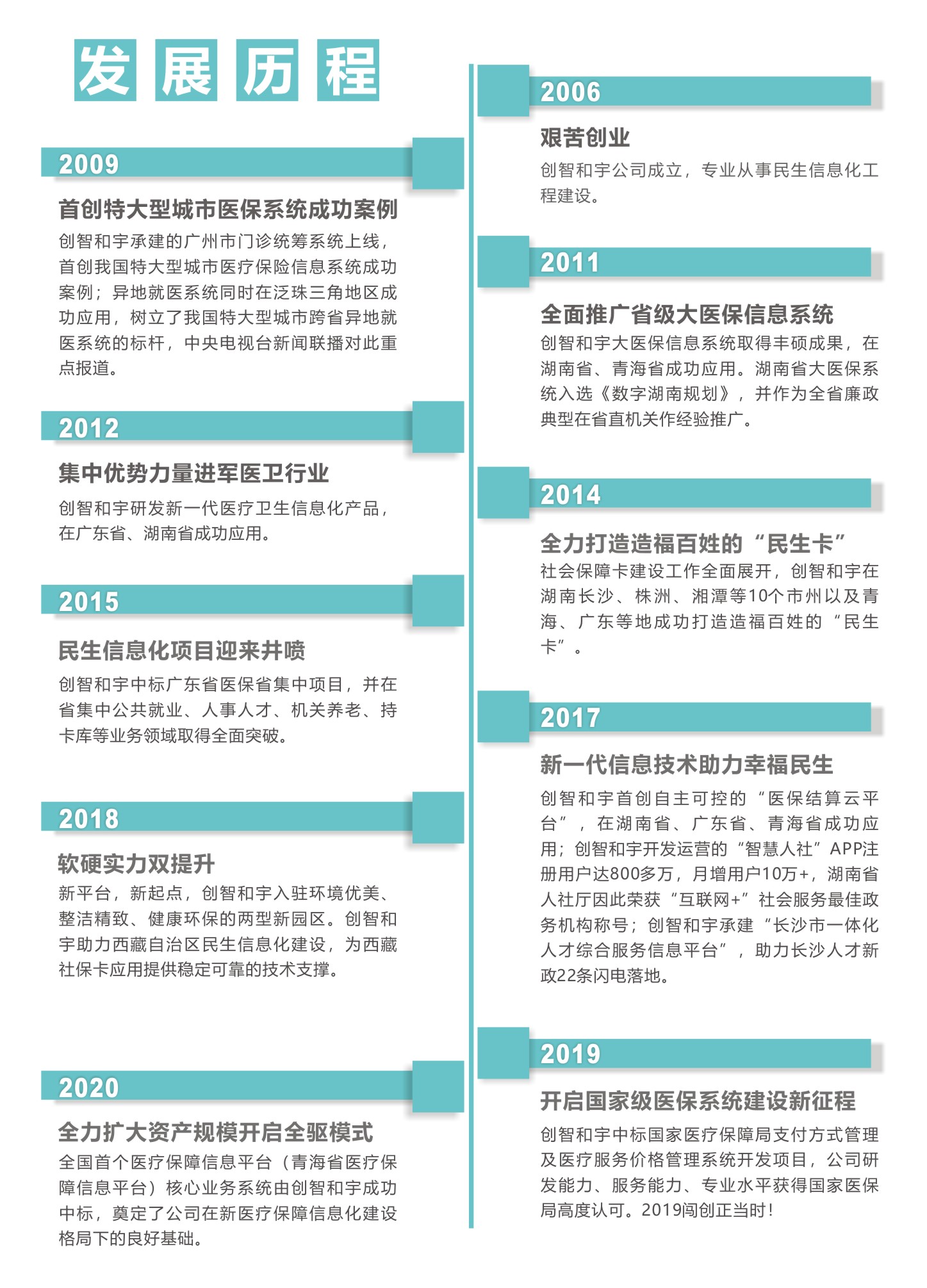 创智和宇成立于2006年,主要服务于国家医保、人社、卫健、税务等政府民生行业信息化,业务覆盖湖南、广东、青海、西藏等十余个省市自治区及多个国家部委,已累计承建民生信息化项目1,500多个,实施成功率100%,为200多家政府机构、30多万家企事业单位提供了信息化服务,惠及全国2亿民众。